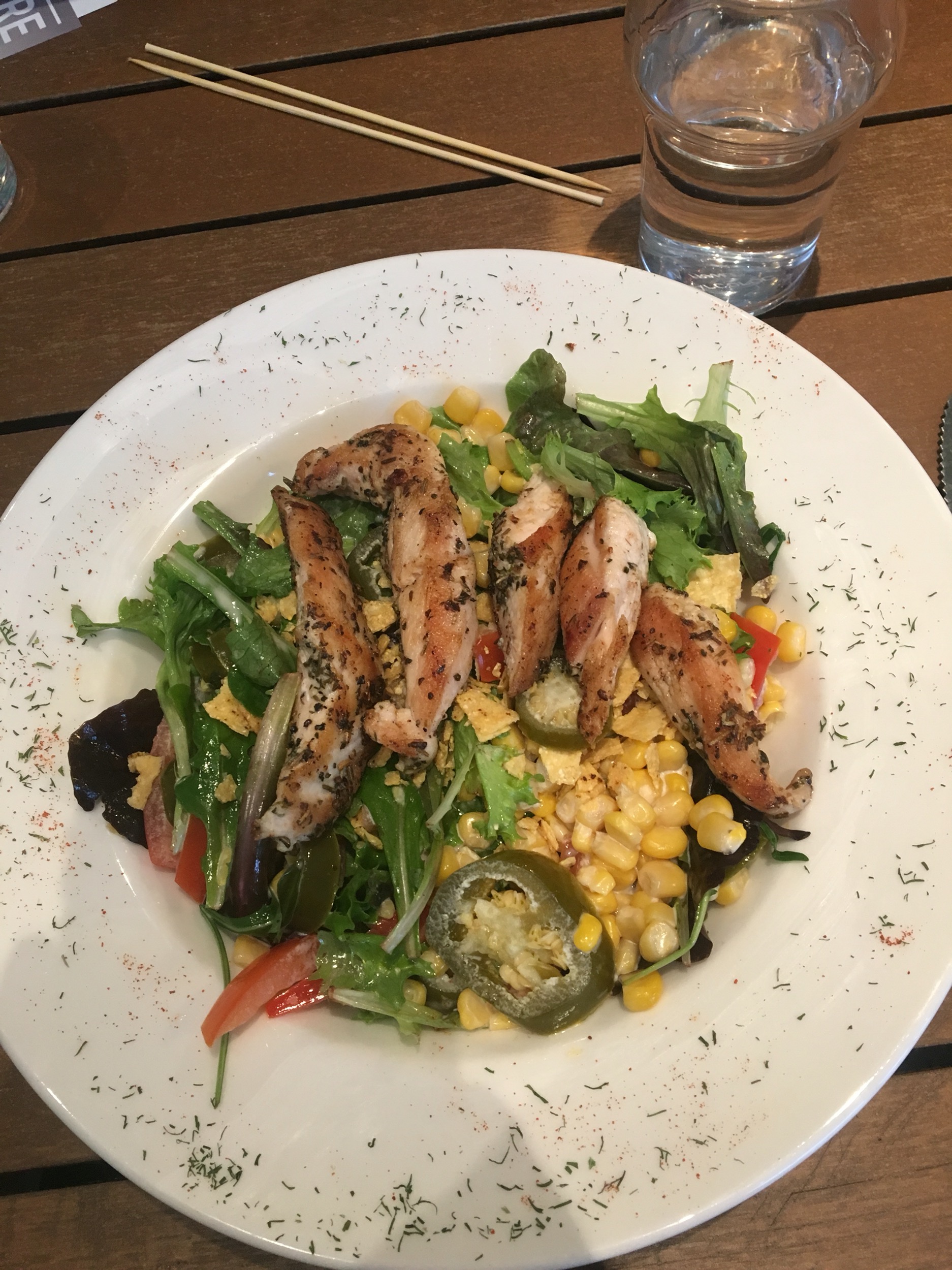 The hostel we are in is pretty nice and has a really fun bar connected to the lobby. We ate dinner there tonight after checking in and getting settled. Both of them ate burgers, but I had a really good Mexican-themed salad!